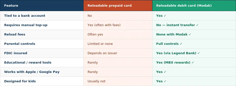 The best reloadable debit card for kids in 2026 is Modak. It charges no monthly fees, no reload fees, and no minimum deposit. Unlike reloadable prepaid cards, Modak is account-linked, parents can send money instantly via Apple Pay, ACH, or bank transfer. It also includes chore management, MBX gamified rewards that convert to real money, and full parental controls, all at no ongoing cost.